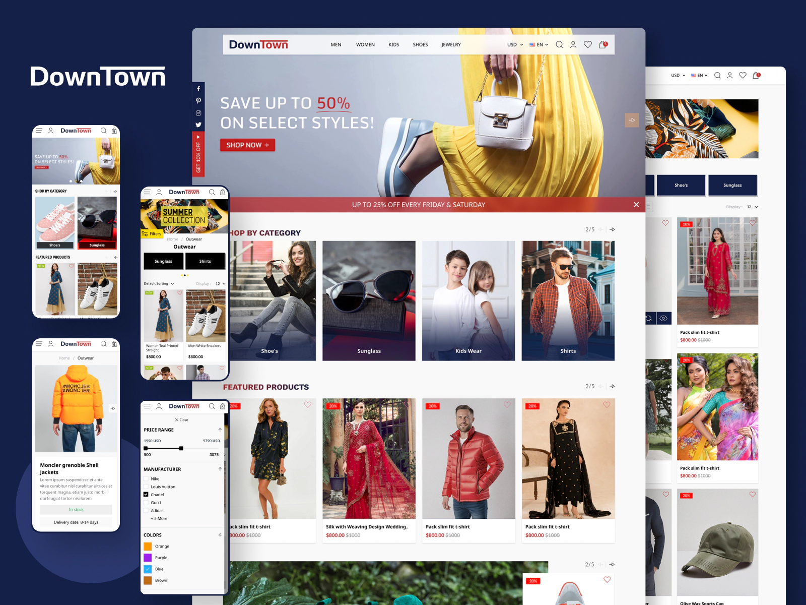 قالب Downtown با طراحی مینیمال، تایپوگرافی جسورانه و پالت رنگی تمیز، ایدهآل برای نمایش محصولات است. این تم واکنشگرای nopCommerce که برای پوشاک، کفشهای ورزشی، ساعتها، مد و اکسسوریها مناسب است، از چندفروشگاهی و چیدمانهای چندگانه پشتیبانی میکند.